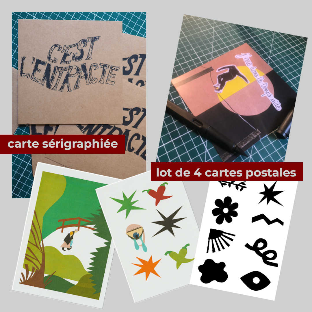 un lot de 4 cartes postales imprimées, 3 au format A6 sur papier 250gr blanc satiné, 1 imprimée recto/verso sur papier 200gr blanc satiné 14x14 cm